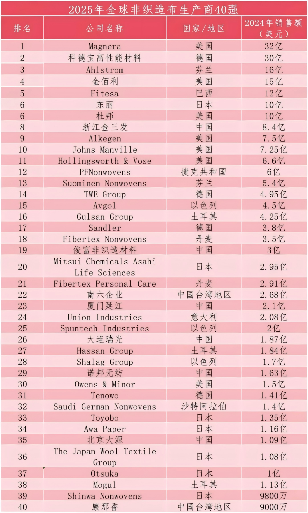 企業榮譽 2025年全球非織造布生產商40強